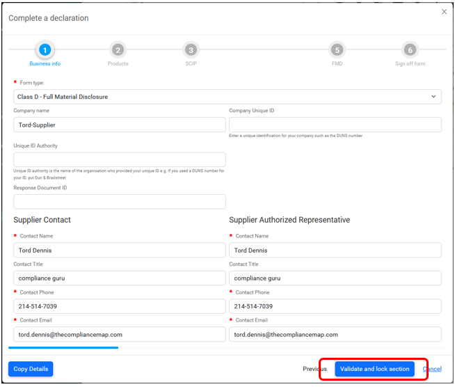 Click the Validate and lock section button when done completing the mandatory fields. Correct any errors as applicable.