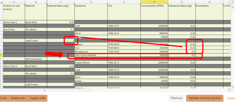 For the Lead frame I know the total mass is 1.00 gm but I do not have all of the substance information (or I do not wish to disclose it), but I cannot declare 0.70 gm of substances and successfully validate the data.