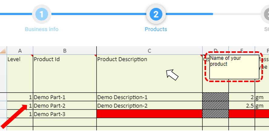 The Products section of the data collection form is a mandatory section. Click in the appropriate cell to add data to the mandatory fields in red.