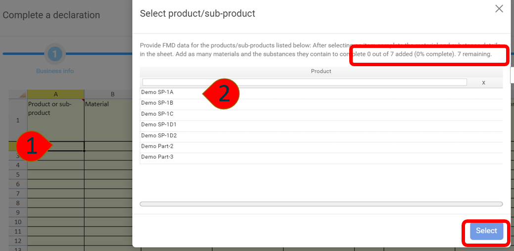 A pop-up window will appear listing all off the Products and Sub-Products that require material and substance data.