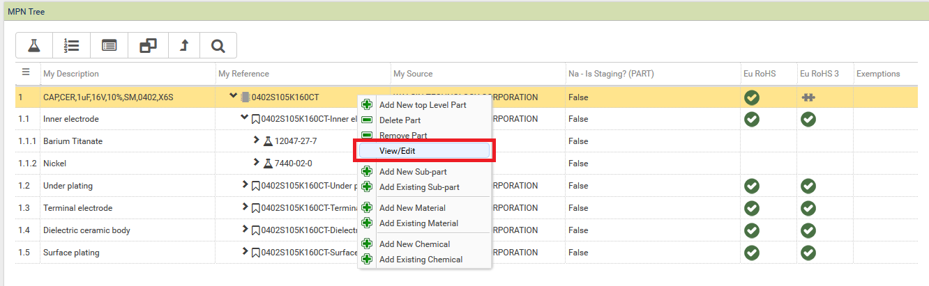Step 2 - Right click on the internal part number and select View/Edit
