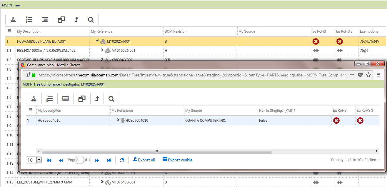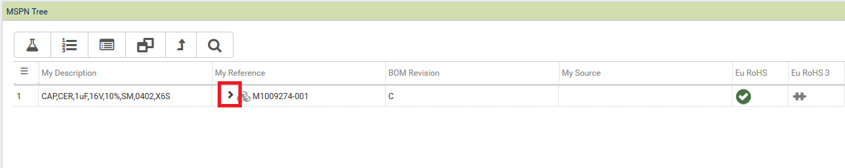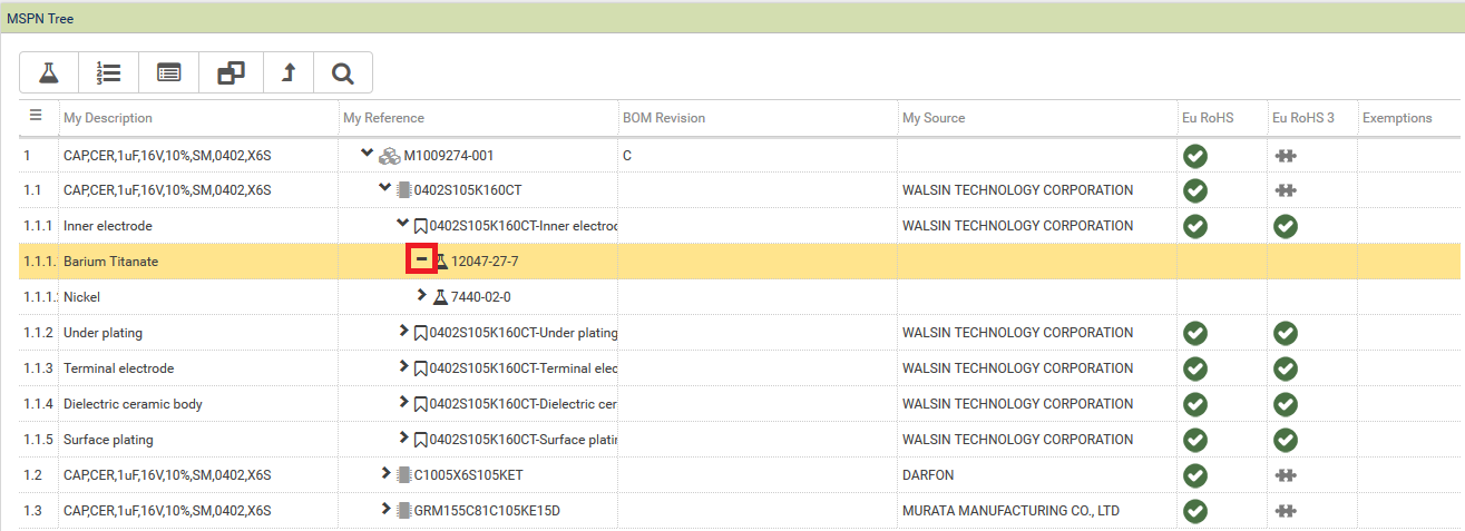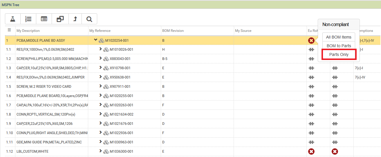 If there are many levels and items on the tree the user can filter to display only items of a particular Compliance status for a particular verdict. For example if only Non-compliant items in the tree were required for the Eu RoHS verdict the user would LH click on the NC icon in the Eu RoHS column at the top of the tree and select Parts only